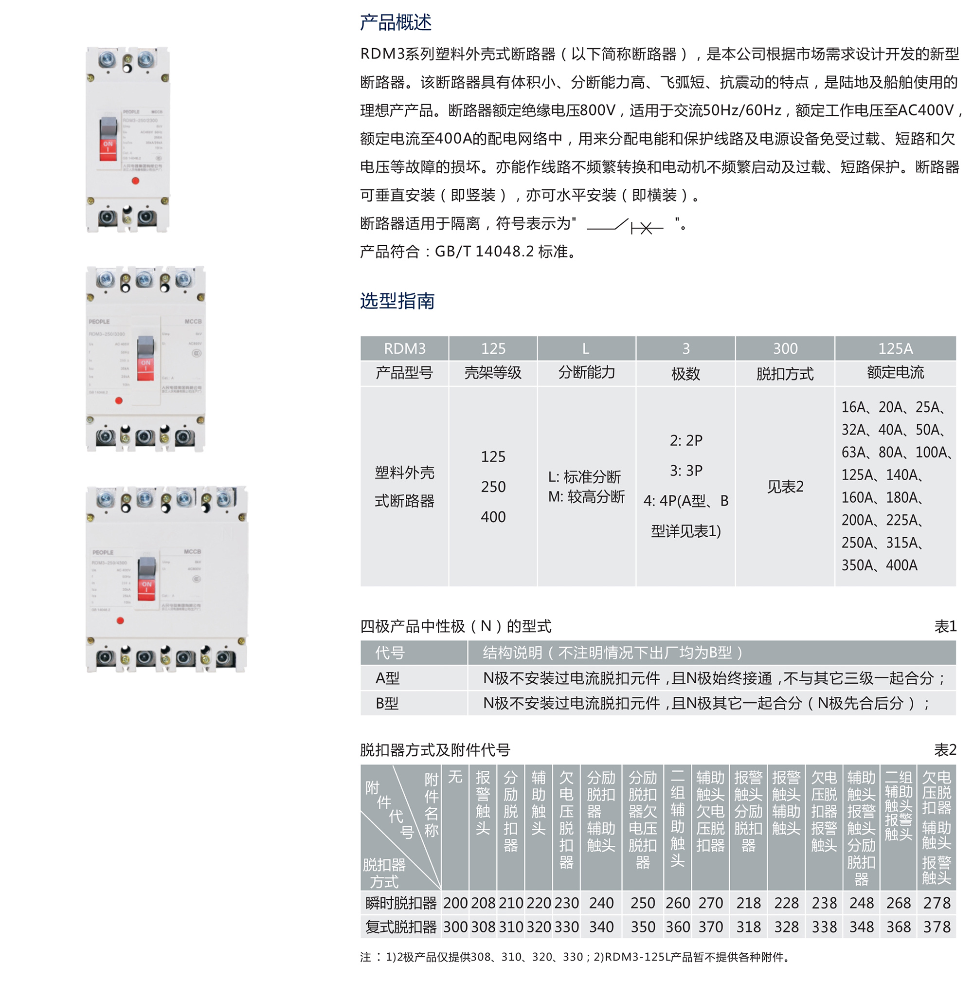 RDM3系列塑料外殼式斷路器(以下簡稱斷路器),是本公司根據(jù)市場需求設(shè)計開發(fā)的新型斷路器。該斷路器具有體積小、分斷能力高、飛弧短、抗震動的特點,是陸地及船舶使用的理想產(chǎn)產(chǎn)品。斷路器額定絕緣電壓800V,適用于交流50Hz/60Hz,額定工作電壓至AC400V,額定電流至400A的配電網(wǎng)絡(luò)中,用來分配電能和保護線路及電源設(shè)備免受過載、短路和欠電壓等故障的損壞。亦能作線路不頻繁轉(zhuǎn)換和電動機不頻繁啟動及過載、短路保護。斷路器可垂直安裝(即豎裝),亦可水平安裝(即橫裝)。