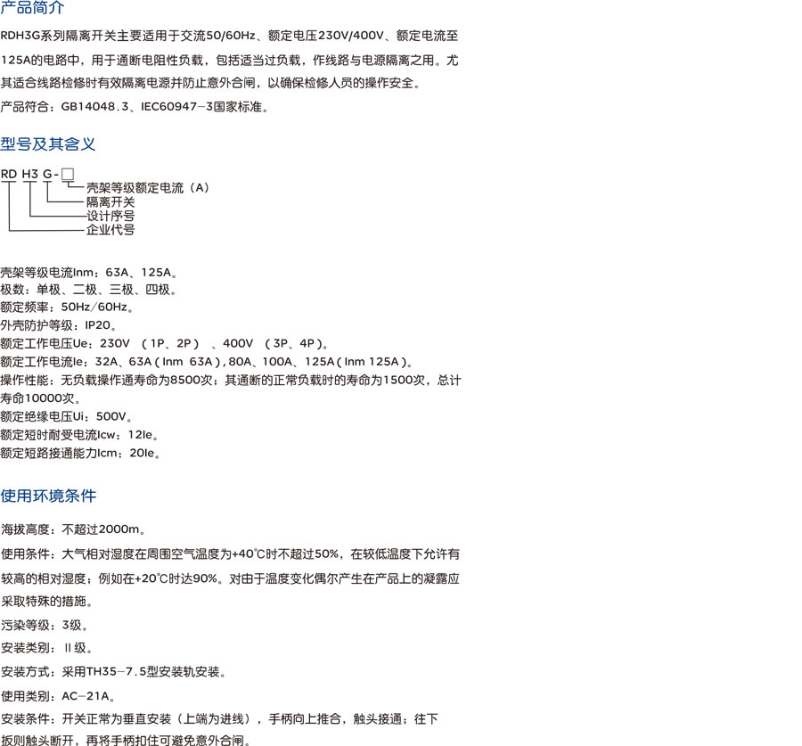 RDH3G系列隔離開關(guān)主要適用于交流50/60Hz、額定電壓230V/400V、額定電流至125A的電路中,用于通斷電阻性負(fù)載,包括適當(dāng)過負(fù)載,作線路與電源隔離之用。尤其適合線路檢修時(shí)有效隔離電源并防止意外合閘,以確保檢修人員的操作安全。