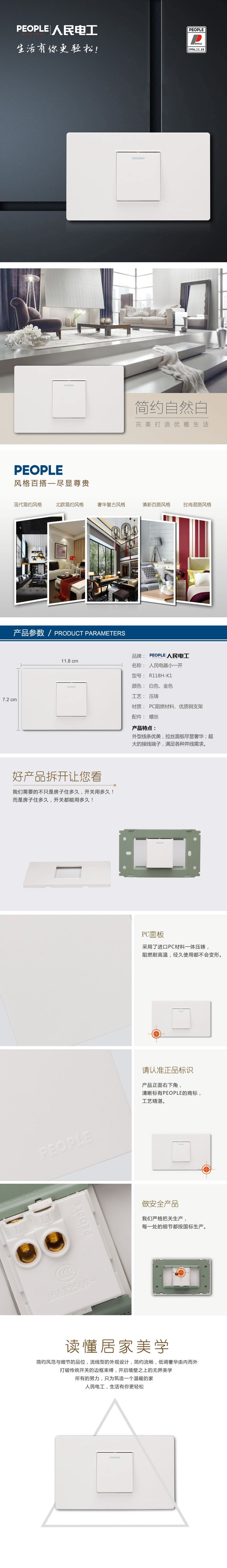 型號(hào):R118H-K1(單控)、R118H-K2(雙控)、R118H-DK(多控) 一聯(lián)開關(guān);顏色:白色,金色