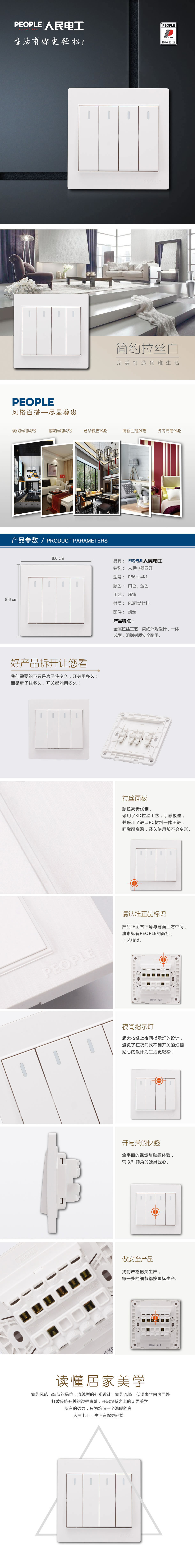 型號:R86H-4K1(單控)、R86H-4K2(雙控) 四聯(lián)開關(guān);顏色:白色、金色