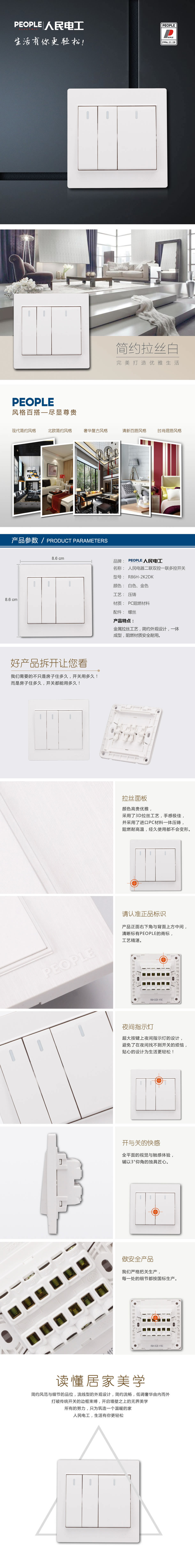 型號(hào):R86H-2K2DK 二聯(lián)雙控、一聯(lián)多控開(kāi)關(guān);顏色:白色、金色