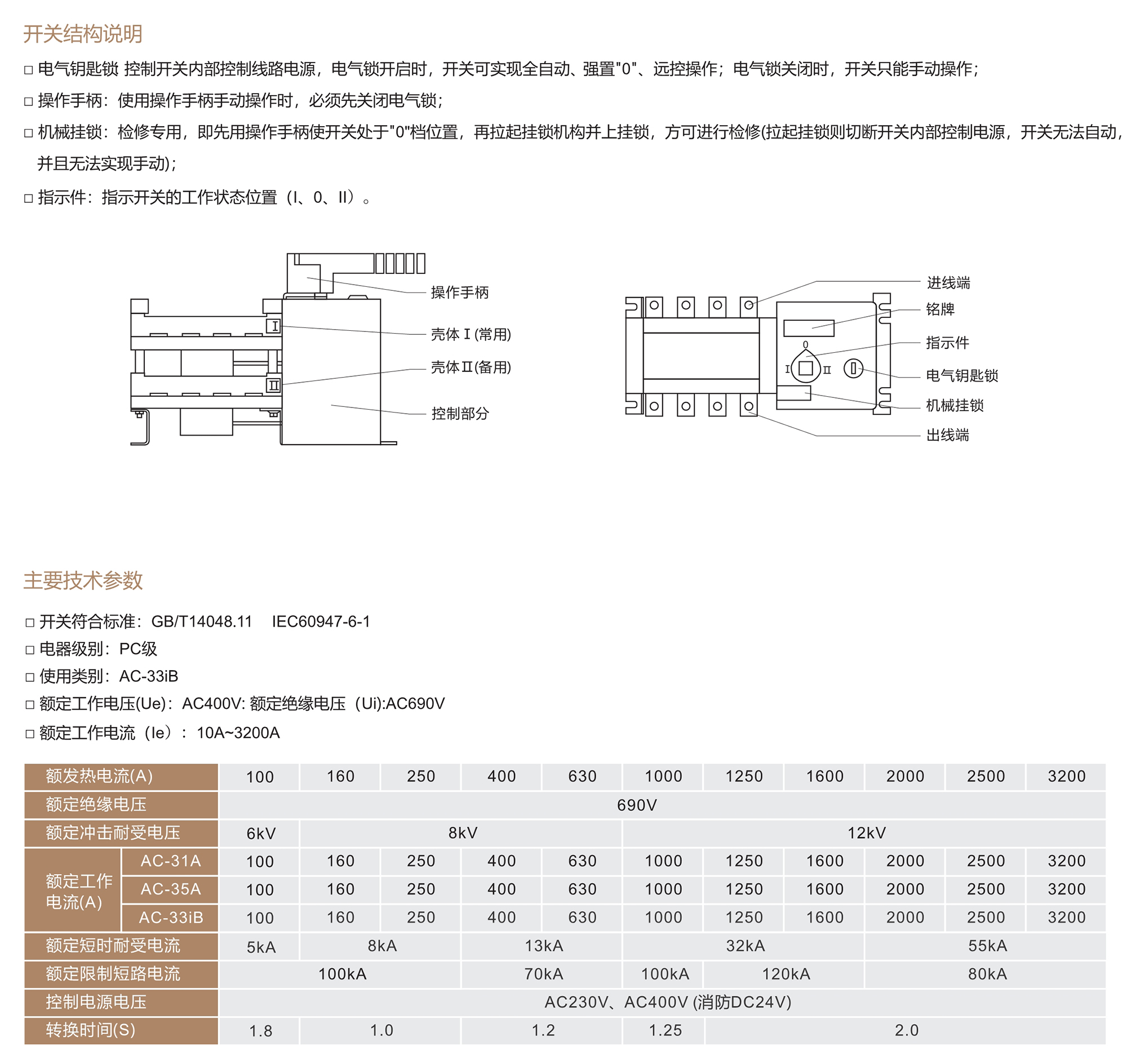 自動(dòng)轉(zhuǎn)換開關(guān);它適用于交流50Hz、額定電壓AC400V、約定發(fā)熱電流至3150A的工企業(yè)配電
