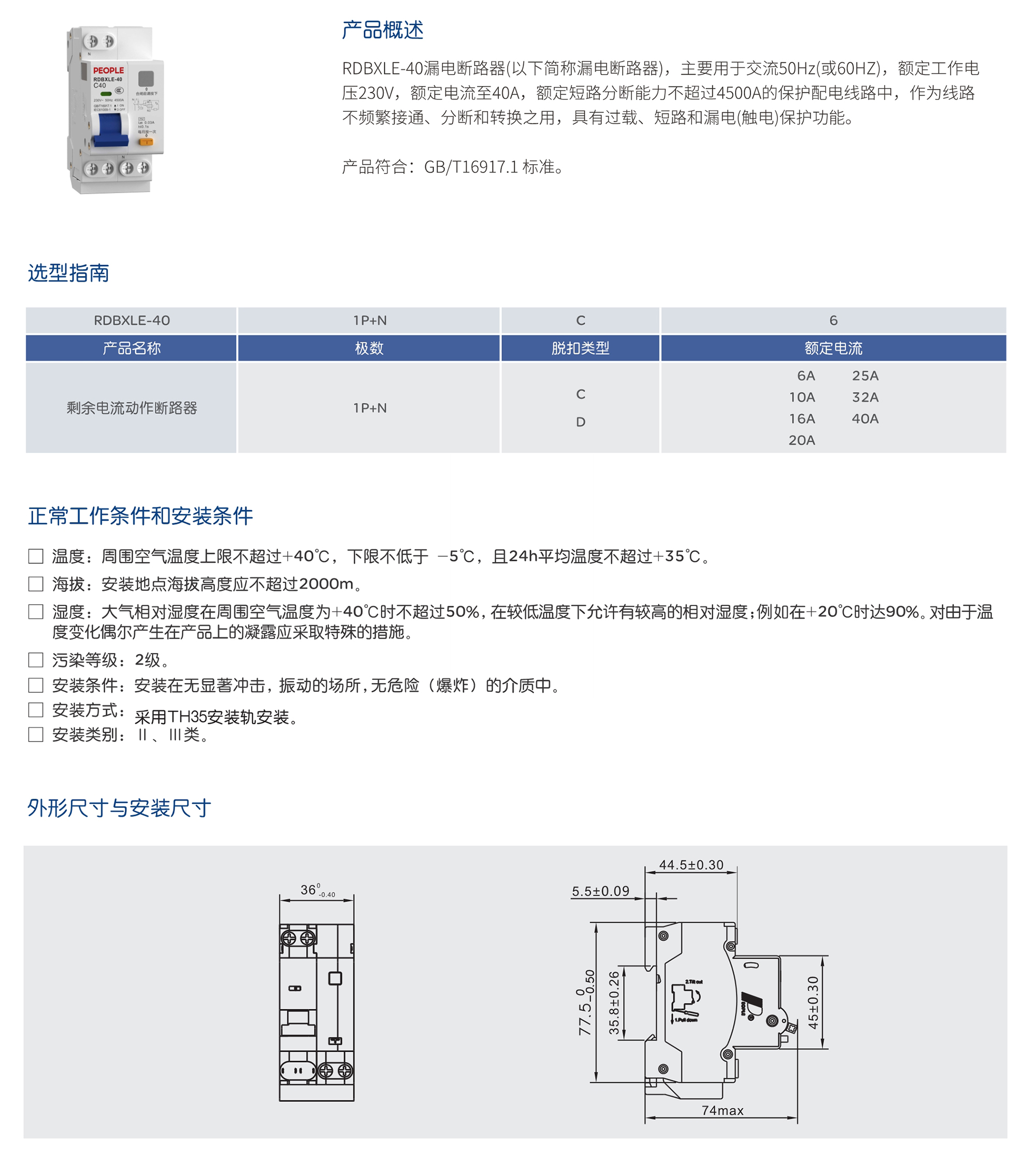 RDBXLE-40漏電斷路器(以下簡稱漏電斷路器),主要用于交流50Hz(或60HZ),額定工作電壓230V,額定電流至40A,額定短路分斷能力不超過4500A的保護配電線路中,作為線路不頻繁接通、分斷和轉(zhuǎn)換之用,具有過載、短路和漏電(觸電)保護功能。