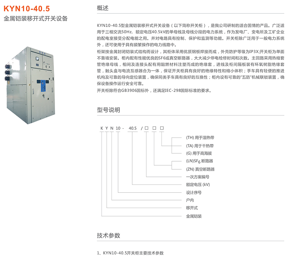 KYN10-40.5型金屬鎧裝移開式開關(guān)設(shè)備(以下簡稱開關(guān)柜),是我公司研制的適合國情的產(chǎn)品。廣泛適用于三相交流50Hz額定電壓40.5kV的單母線及母線分段的電力系統(tǒng),作為發(fā)電廠、變電所及工礦企業(yè)的配電室接受分配電能之用。并對電路具有控制、保護(hù)和監(jiān)測等功能。開關(guān)柜除廣泛用于一般電力系統(tǒng)外,還可使用于具有頻繁操作的電力線路中。