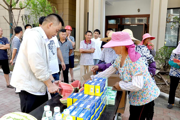 2020年8月7日,受總經(jīng)理胡國平委托,人民萬福國際商貿(mào)城監(jiān)事長鄭正拓?cái)y行政辦公室和工程部人員到施工現(xiàn)場(chǎng),慰問奮斗在一線的工友們,并給工友們送去了礦泉水、西瓜、人丹、藿香正氣水等消暑物資,讓廣大一線工友們?cè)谘籽紫娜崭惺艿搅松钌顩鲆狻?/div>