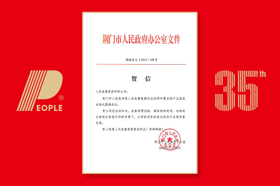 荊門市人民政府辦公室發(fā)來賀信,祝人民電器集團(tuán)創(chuàng)業(yè)35周年暨總部產(chǎn)業(yè)園落成典禮圓滿成功,他們?cè)谫R信中表示人民電器創(chuàng)業(yè)35年來依靠管理創(chuàng)新,確保持續(xù)改進(jìn),在制造業(yè)智能化轉(zhuǎn)型升級(jí)的背景下,以積極進(jìn)取的姿態(tài)促進(jìn)行業(yè)高質(zhì)量發(fā)展。在賀信中他們衷心祝愿集團(tuán)再創(chuàng)偉業(yè)!再鑄輝煌!