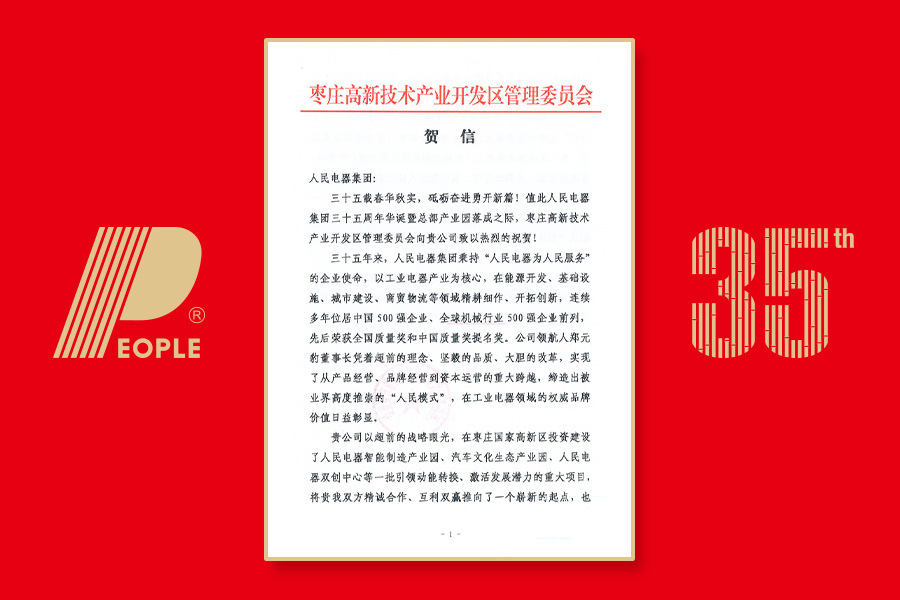 棗莊市高新技術(shù)產(chǎn)業(yè)開發(fā)區(qū)管理委員會(huì)發(fā)來賀信,向人民電器集團(tuán)致以熱烈的祝賀。祝愿棗莊國家高新區(qū)同人民電器一道,在深化合作、共享共贏的道路上闊步向前、行穩(wěn)致遠(yuǎn)。