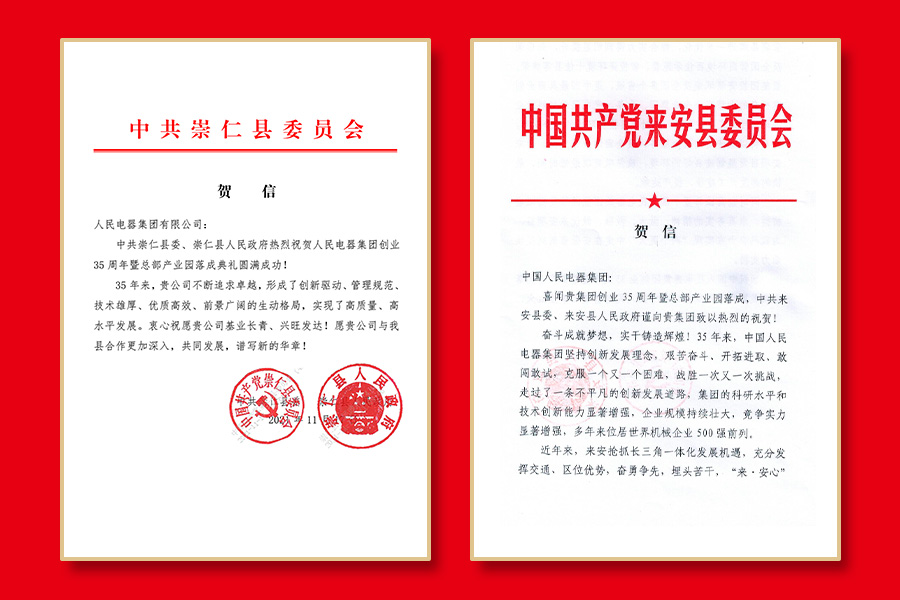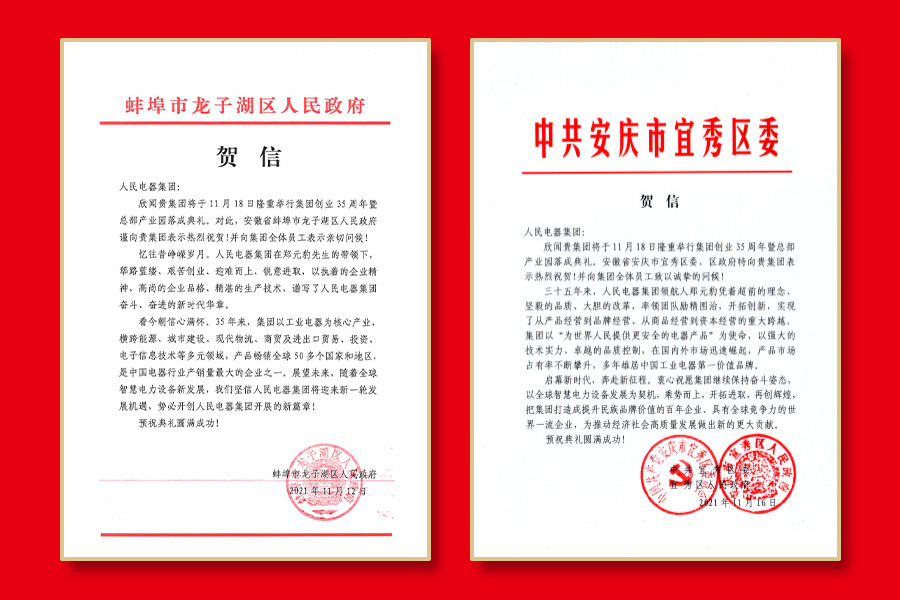 安慶市市委、市政府發(fā)來賀信,向人民電器集團(tuán)表示熱烈祝賀!并向集團(tuán)全體員工表示親切問候!他們?cè)谫R信中表示,人民電器集團(tuán)從小到大,從大到強(qiáng),從樂清走向世界,成為中國電氣行業(yè)的標(biāo)桿,成為享譽(yù)世界的品牌。祝愿人民集團(tuán)在鄭元豹主席的帶領(lǐng)下迎來新一輪高質(zhì)量發(fā)展,永葆基業(yè)長青!