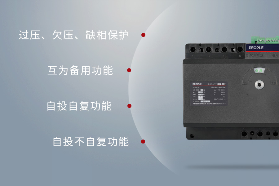 功能強(qiáng)大,才能無(wú)懼意外。RDQH5Y系列雙電源自動(dòng)轉(zhuǎn)換開(kāi)關(guān)適用于交流50Hz、額定工作電壓400V、額定工作電流125A及以下的供電系統(tǒng),可根據(jù)需求或具體電路情況進(jìn)行兩路電源之間的切換選擇,具有過(guò)壓、欠壓、缺相保護(hù)功能,同時(shí)還具備自投自復(fù)、自投不自復(fù)、互為備用功能。